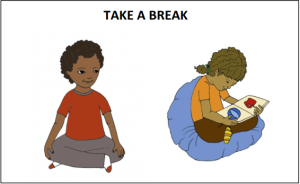 The next day, teachers make a visual to help Khalid ask for a break at circle time, and encourage him to use it before the puppet comes out. They give him lots of warnings, saying things like “Today, the puppets will be at circle. If you want to take a break when the puppets are out, that is okay! You can show us this break card.”